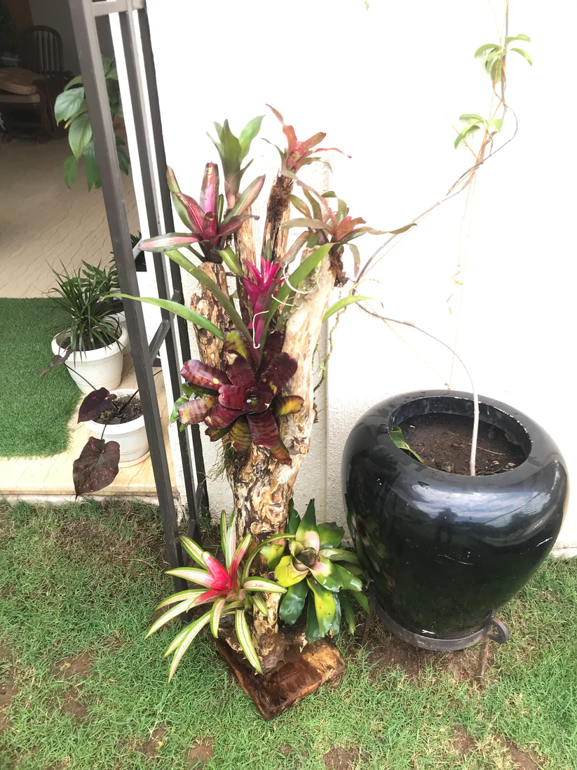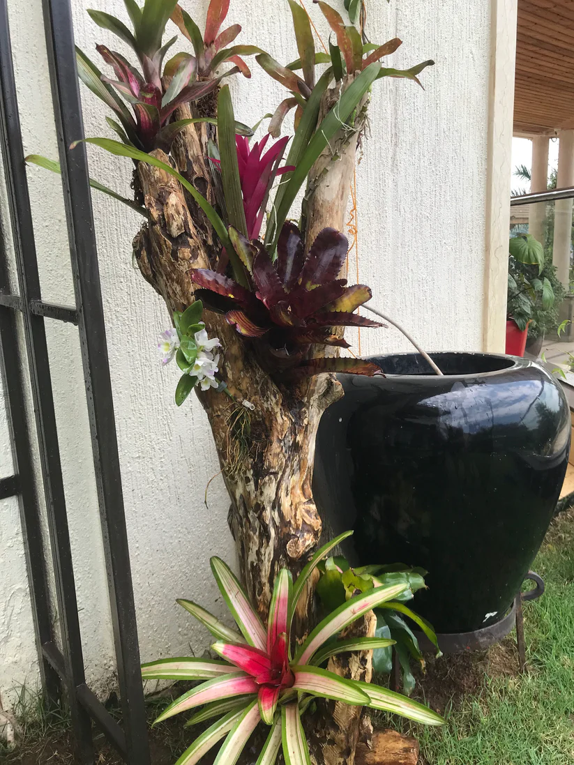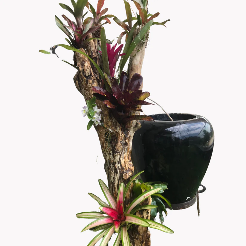 This mount is more than a garden feature β€” it’s a resurrection story. Crafted from the stump of a once-cut guava tree, it now breathes with vibrant life, wrapped in the bold foliage of Neoregelias, Guzmanias, and cascading succulents.